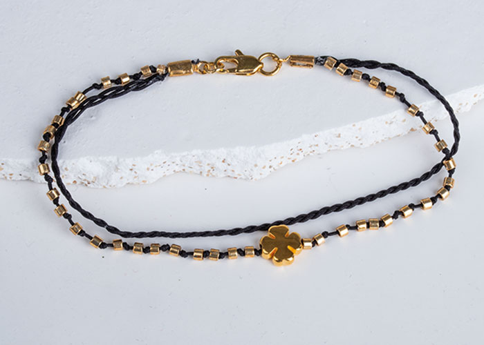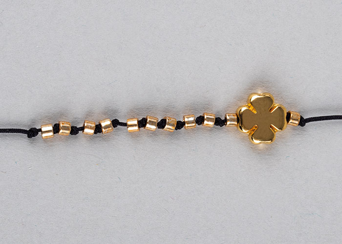 Auf den 70 cm Strang mittig das Kleeblatt fädeln. Danach eine Rocailles auffädeln und direkt an die Rocailles einen Knoten setzen. Abwechselnd Rocailles und Knoten setzen, bis alle 21 Rocailles aufgefädelt sind. Genauso wird die andere Seite gearbeitet.