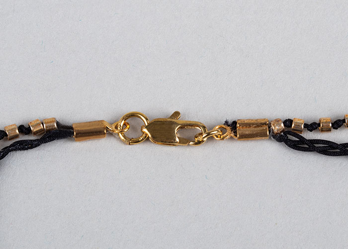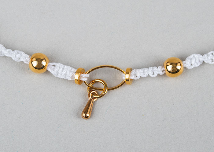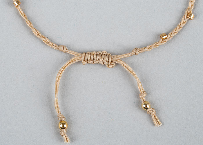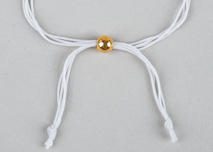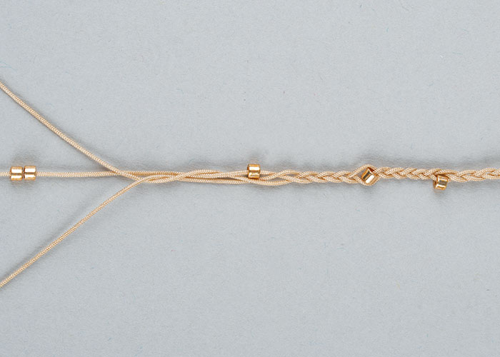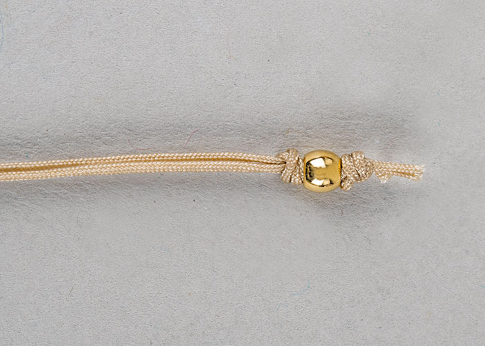 Als Verschluss werden die 2 × 4 Fäden gegengleich durch eine Abstandsperle gefädelt und die Enden je mit einem Knoten verschlossen.