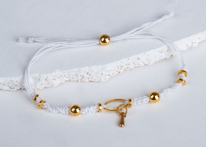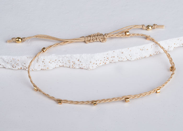 Mit einem Makramee-Schiebeknoten das Armband schließen. Dafür die Armband-Enden gegeneinander parallel zusammenlegen. Ein Stück Faden mittig mit einem Knoten befestigen und mit diesem Faden mehrere Kreuzknoten2 setzen (ca. 1,5 cm). Abstandsperlen auffädeln und die Enden je mit einem Knoten verschließen.