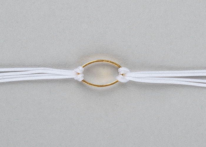 An den beiden kurzen Seiten des Ovals je zwei doppeltgelegte Schmuckkordelabschnitte mit einem Ankerknoten1 befestigen, sodass 4 Fäden entstehen.