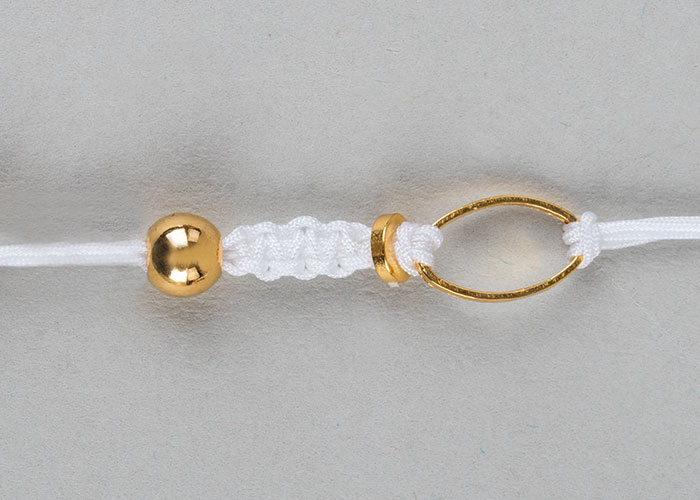 Im Anschluss 10 Spiralknoten fertigen. Verwende hier die Kreuzknotentechnik, wobei die Schlaufe immer auf der gleichen Seite gesetzt wird. So dreht sich das Band ein. Abstandsscheibe einfädeln, Knoten setzen, Abstandsscheibe einfädeln und Knoten setzen.