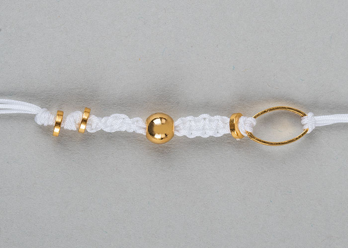 Darauf je eine Abstandsscheibe fädeln. Jetzt 8 halbe Kreuzknoten2 setzen und eine Abstandsperle auffädeln.