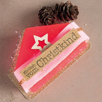 Bei den Seifen mit Motiv bzw. Schriftzug positionierst du das Label mit der Prägung nach oben in die gereinigte Gießform.4 ![]()