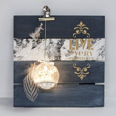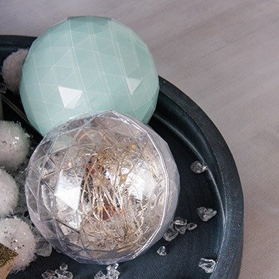 90 min Anleitung in 9 Schritten Auf dem schlichten Holz-Tablett wirken die beiden Kugeln edel und modern. Chalky Finish in apricot für die eine Kugel, die andere erhält im Inneren eine Spiegelfolie und eine LED-Lichterkette.