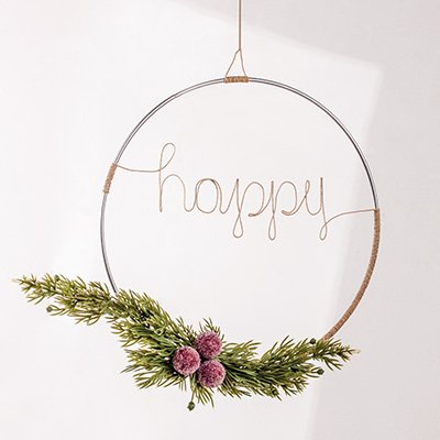Die Holzschrift befestigst du mit Hilfe des weißen Papierdrahtes am Metallring. Dazu formst du eine Schlaufe zwischen dem Buchstaben „DO“ bzw. „Happy“ und drehst den Draht zusammen bis zum Metallring.3 ![]()
