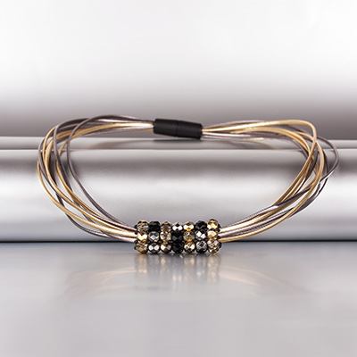 Enfile maintenant ta pièce de joaillerie et mets la chaîne en rond, tenir compte de ta longueur désirée. Fixer les extrémités avec du fil. Couper les restes.9 ![]()