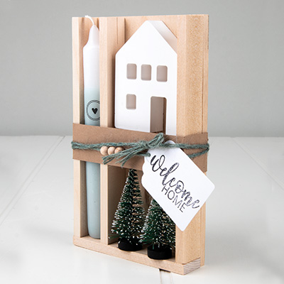 Enroule deux fois le cordon de jute autour de la maison et attache dessus l'étiquette avec le mot "schönsten". Il suffit ensuite de faire un noeud.7 ![]()