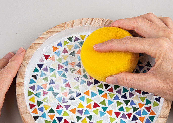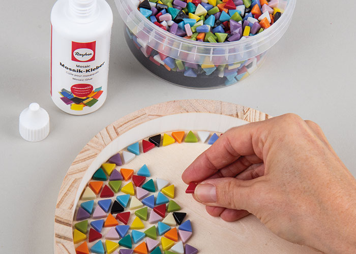 Instructions en 3 étapes Les couleurs vives apportent de la joie. Grâce à la forme triangulaire des tesselles, la forme courbe du plateau peut être facilement couverte.