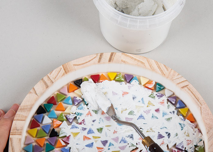 Répartir la pâte à jointoyer uniformément sur les tesselles à l’aide de la spatule.3 ![]()